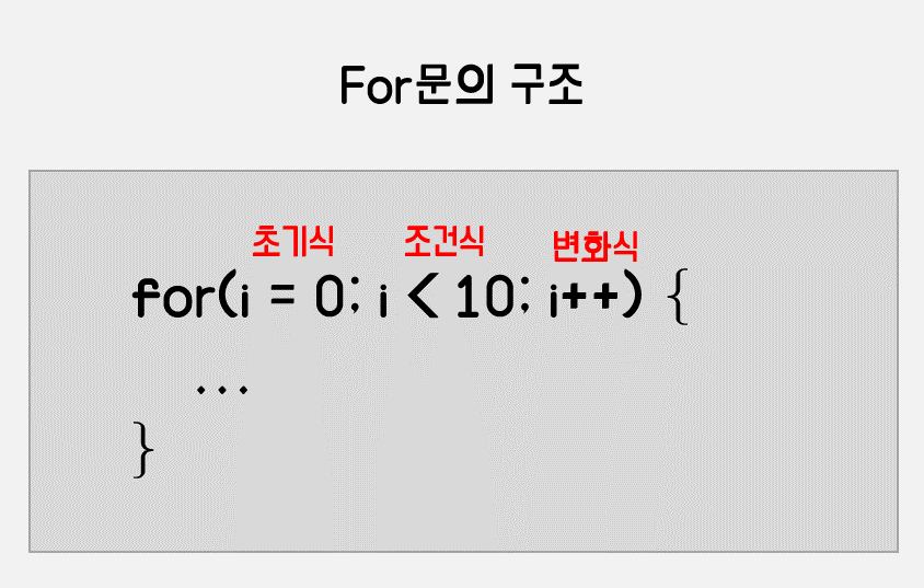 for문은 어떠한 변수 a를 초기화하는 초기식, a에 대한 조건을 적는 조건식, a를 변화시키는 부분인 변화식을 소괄호 안에 한번에 적도록 구조화 시켰다. 그 덕분에 어떠한 회수동안 반복해야 하는 경우, 더 나은 가독성을 지닌 코드를 작성할 수 있도록 하였다. 한번 아래의 코드를 맨 처음 "Hello World"를 10번 출력하는 코드와 비교해봐라.