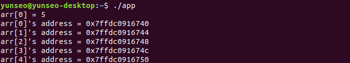 출력하는 변수 앞에 &을 붙히면 변수의 주소값을 반환하고 %p는 메모리 주소값을 출력할 때 사용하는 서식문자이다. 위에서는 배열의 각 주소를 출력하고 있다. Ubuntu 18.04.2 LTS에서 실행해봤을 때 아래와 같은 결과가 나왔다. 결과는 컴퓨터 상황에 따라서 다르게 나올 수 있다.