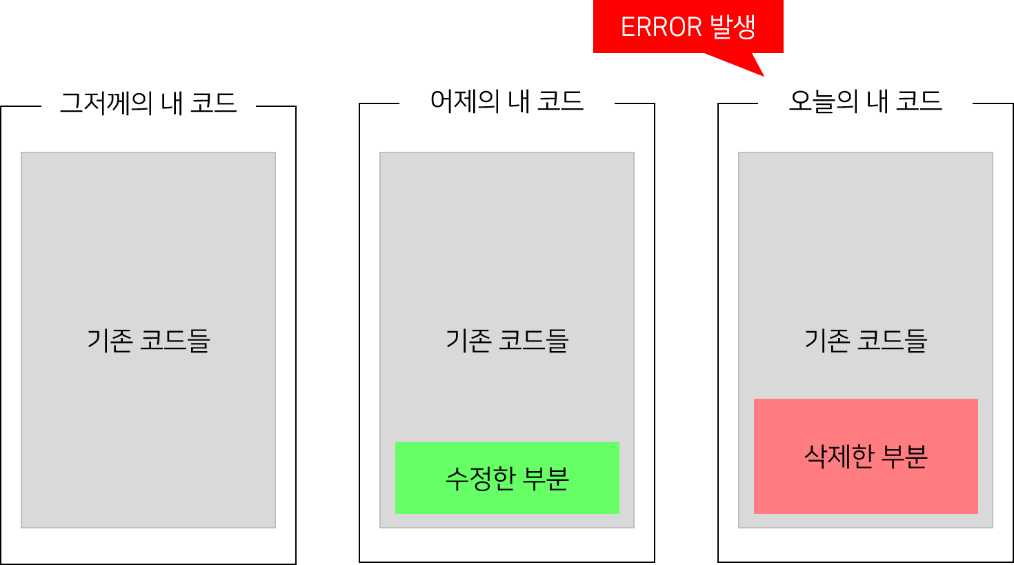 오류가 발생했을 때 이렇게 질문을 할 수 있는 사람은 몇이나 될까? 코드의 변경사항을 매번 기록하는 사람이야 당연히 언제 무엇을 했고 어떤 부분을 만졌는 데 어느 부분에서 에러가 발생했는 지를 정확하게 알 수 있을 것이다. 하지만 그렇지 않은 사람의 현실은 어제 코드를 수정한 부분과 오늘 코드를 삭제한 부분의 기억이 섞이면서 정확하게 내가 뭘 했더니 오류가 발생했는 지를 알 수 없어 정확하게 문제점을 파악할 수 없을 것이다. 그리고 정확하게 어디서부터 어디까지가 어제 정상동작했던 코드이고, 어디서부터 어디까지가 오늘 내가 삭제하여 오류가 발생한 부분인지 몰라 오류가 발생하기 전 지점으로 돌아갈 수조차 없을 것이다. 이러한 부분을 도와주는 것이 Git이라고 생각한다.