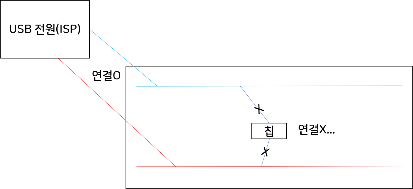 솔직히 말하겠다. 여기서 몇 시간은 소모한 듯하다. 몇 번을 회로를 분해하고 재구성하기를 여러번. 아침을 먹고 시작했던 일이 저녁을 먹을 때쯤에도 계속하고 있을 때쯤 이유를 알았다. 그 이유는 칩의 VCC와 GND에 AVR ISP의 VCC와 GND를 연결 안했었던 것이다. .... 나는 AVR ISP Mk2의 내부 점퍼핀을 연결해서 USB 전원을 연결해서 사용하고 있었는 데, 이때 브레드보드 상에서 빨간색과 파란색으로 보이는 부분에 USB 전원의 VCC와 GND를 연결했다. 그런데 이것을 다른 부분에는 전부 연결했는 데 칩의 VCC와 GND에는 연결하지 않았다. 이게 일단 실패한 이유였다.
