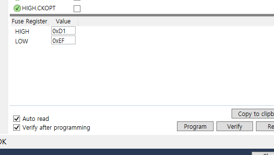 추가적으로 이 퓨즈 비트를 변경하기 위해서는 Program을 클릭하면 되는 데 기본적으로 경고창이 발생하게 될 것이다. 이는 그 만큼 신중하게 변경해야 함을 의미하며 나처럼 1700원짜리 칩을 버리고 싶지 않다면 잘 생각하고 클릭하는 것을 권장한다.