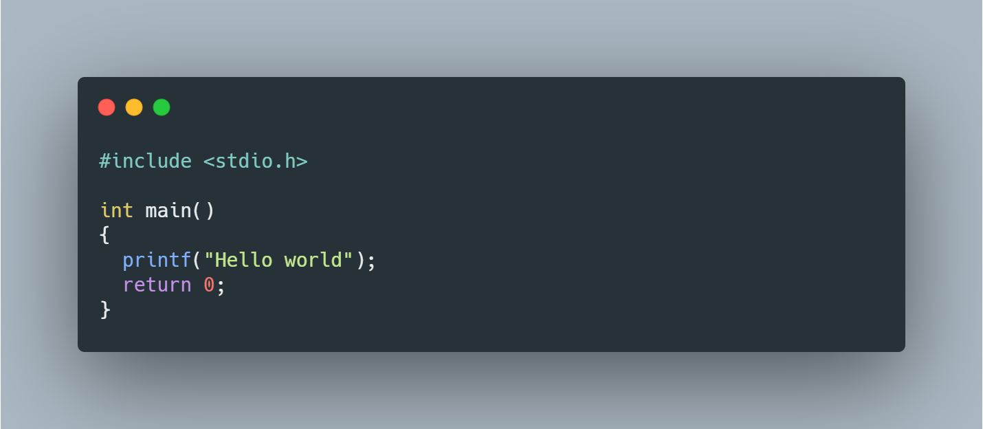아래는 "Hello world"를 출력하는 간단한 C언어 코드를 Carbon을 사용해서 작성하고 Export 한 결과물이다.